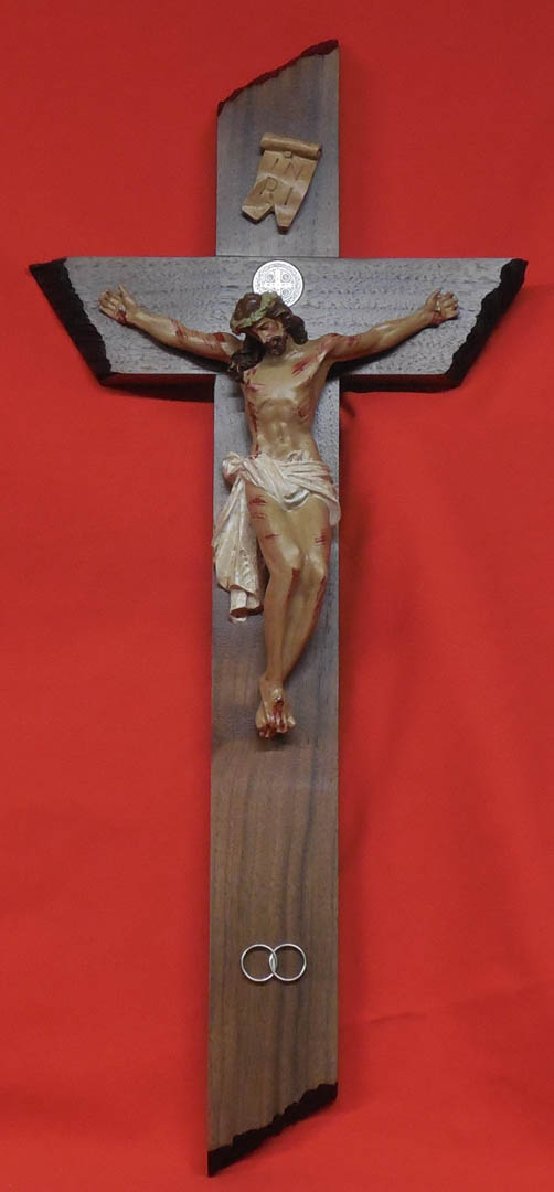 #527 Walnut with angles, distressed ends, rings, St. Benedict medallion, and hand painted polycrylic corpus. Made in October, 2017 for Sheila Size = 27" Price = $329 |