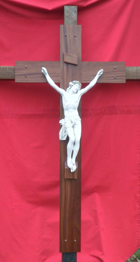 #148 African mahogany with antiqued fiberglass corpus. Made in November, 2011 Size = 61" note: see this hanging at St. Barbara Cemetery in Salem, Oregon! Price = $500 |