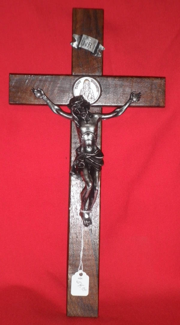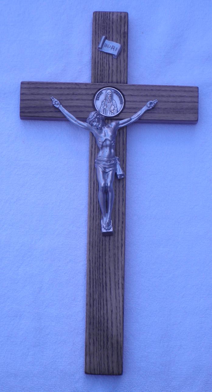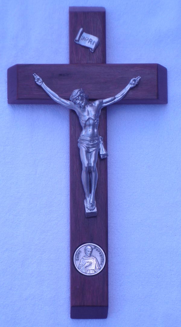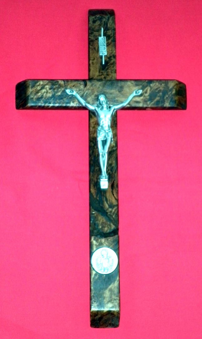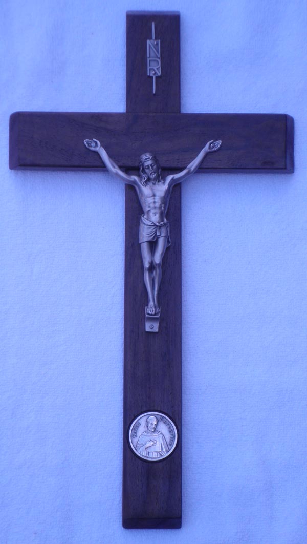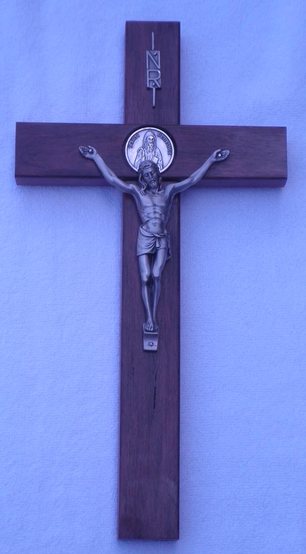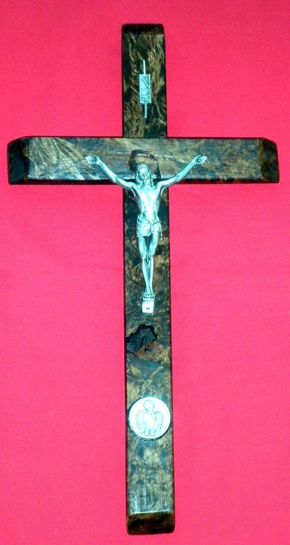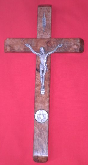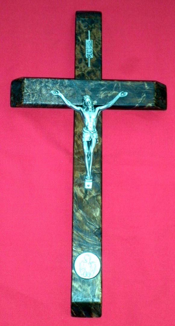 Purpleheart wood with pewter corpus and St. Benedict medal
