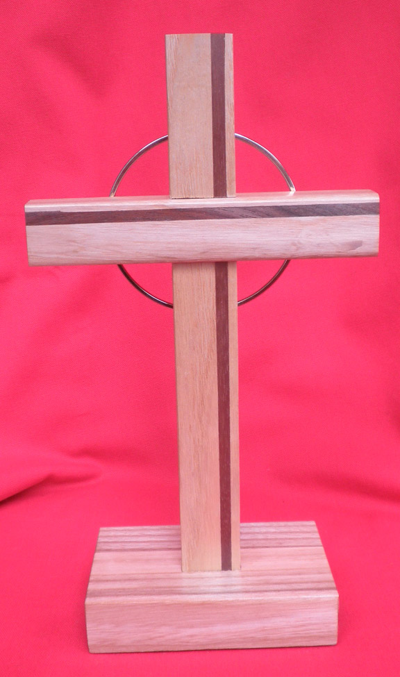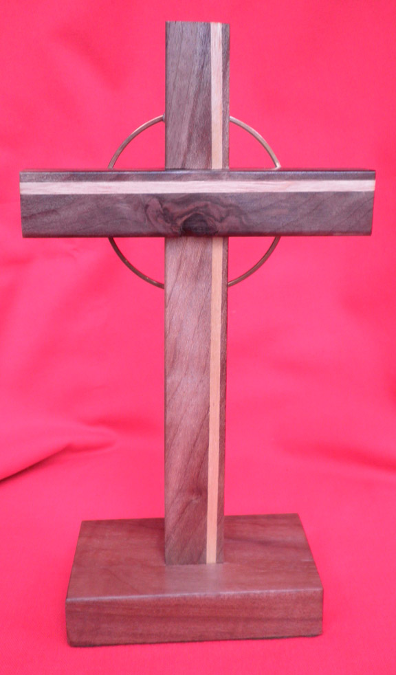Walnut with oak inlay and metal halo ring on a removable pedestal