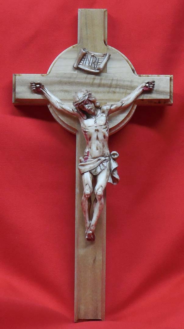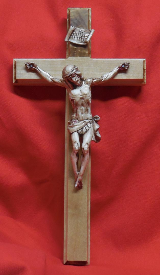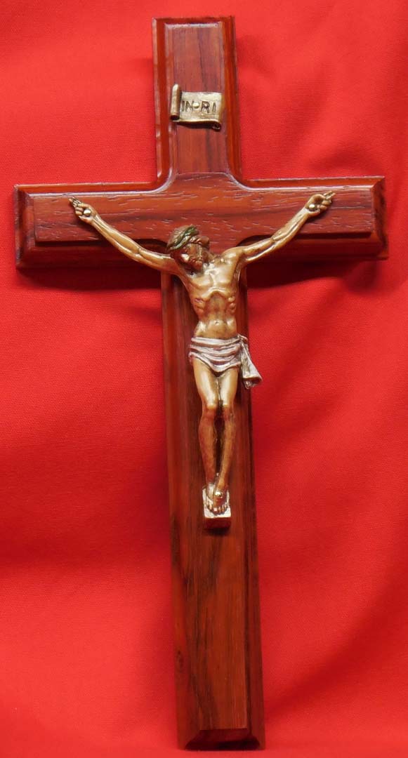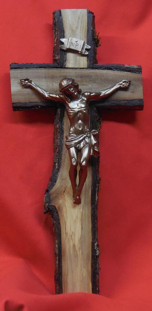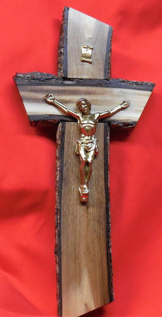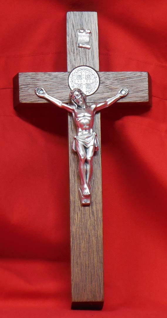 #444 Myrtle wood with trimmed edges and St. Benedict medallion on front and back. Silver metal corpus. Made in December, 2015 Size = 12" Price = $49 |