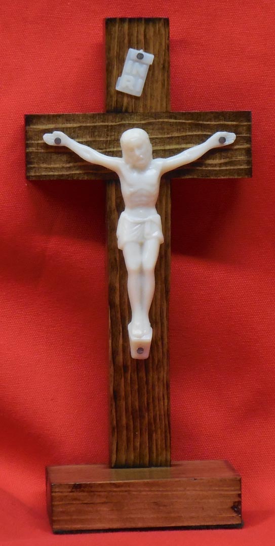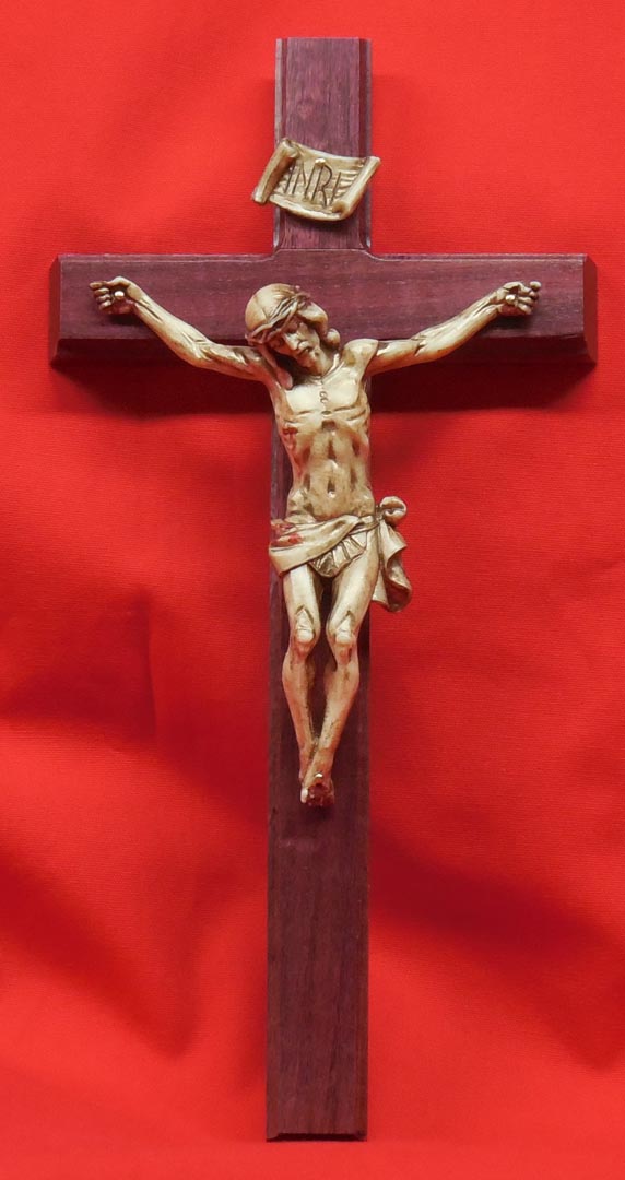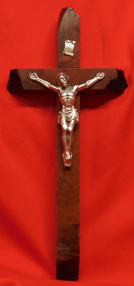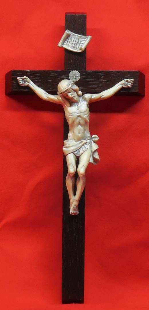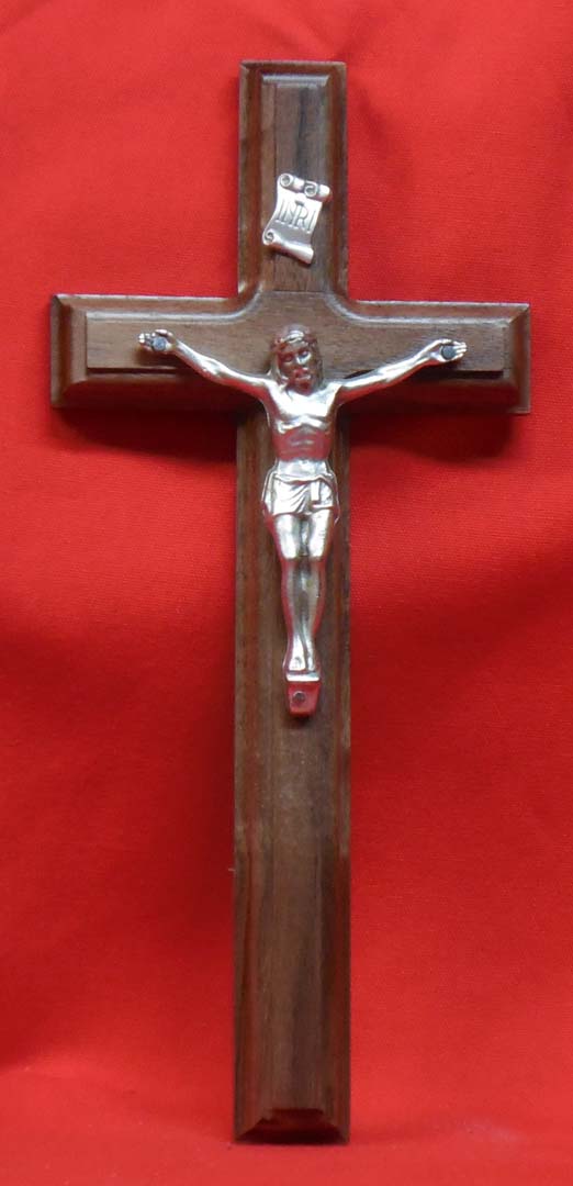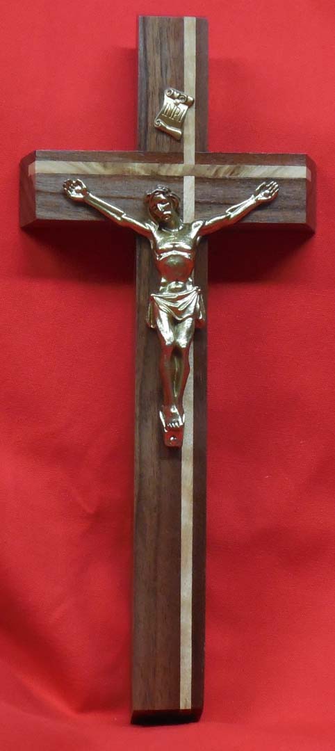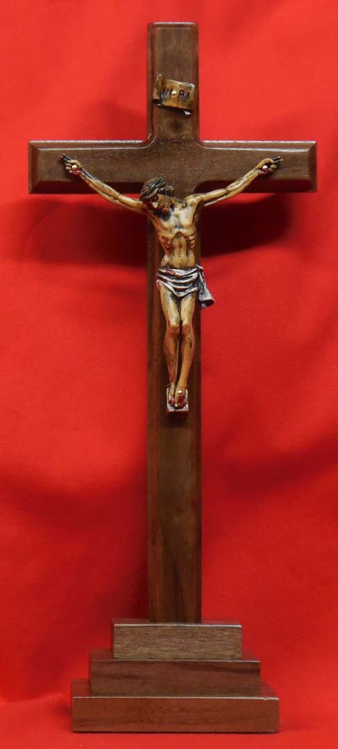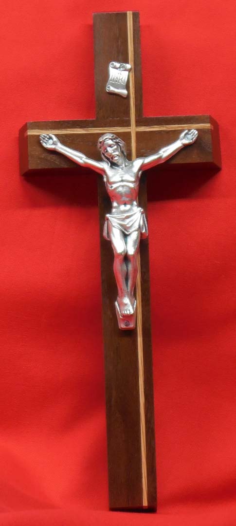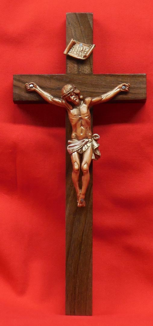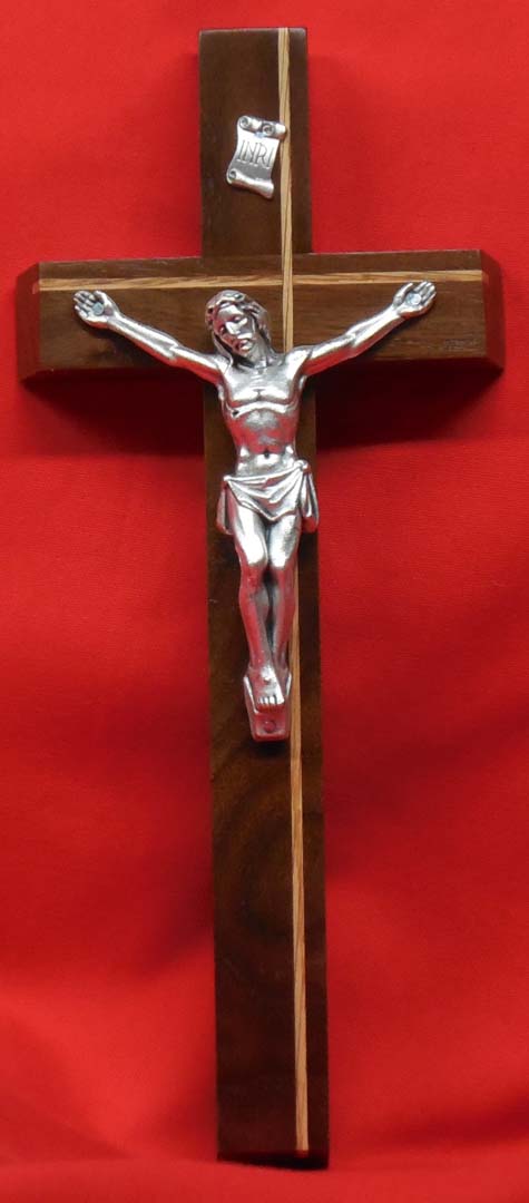 #454 Walnut with stand, silver painted resin corpus, and St. Benedict medallions. Made in February, 2016 Size = 12" Price = $54 |