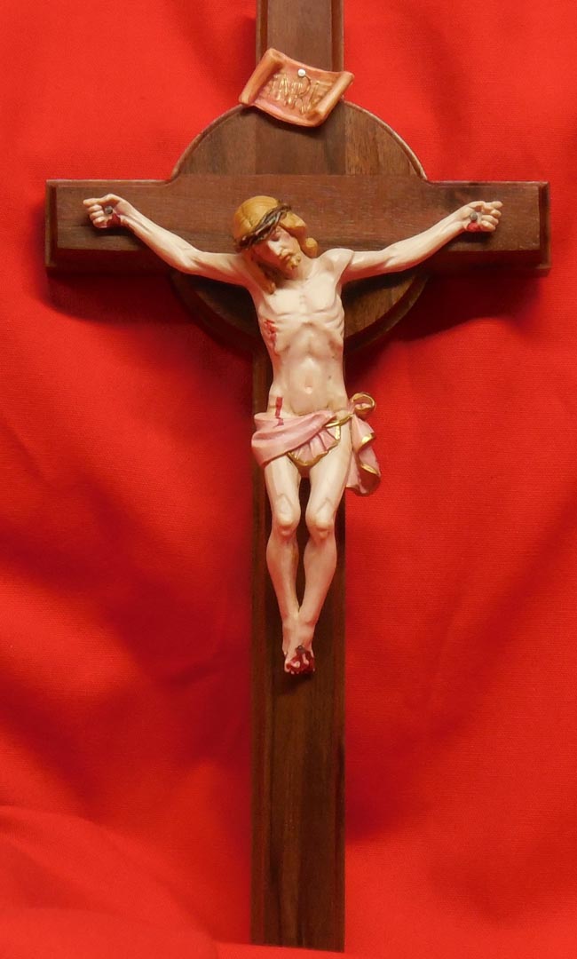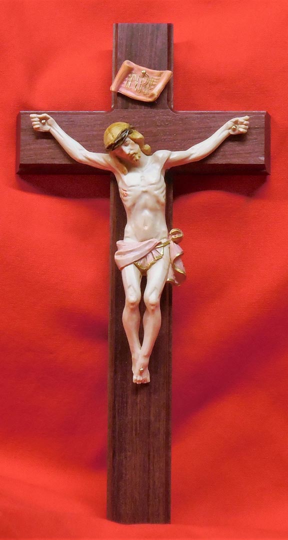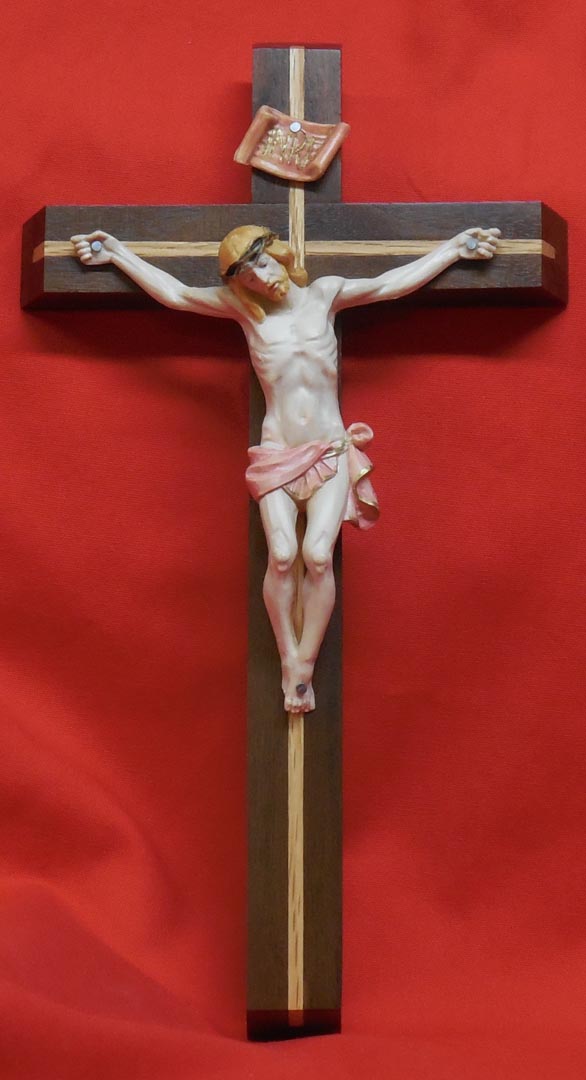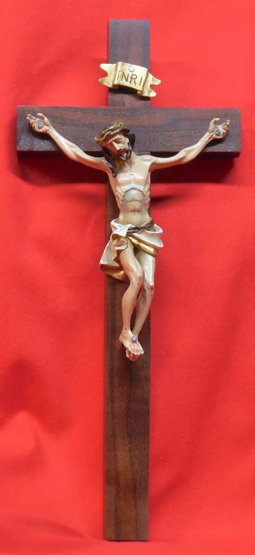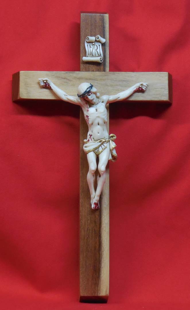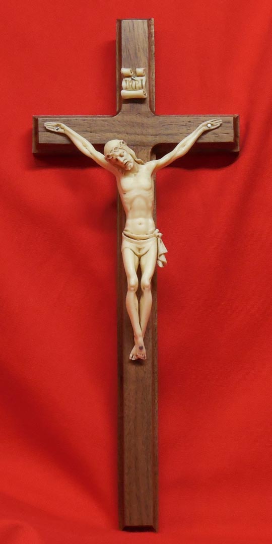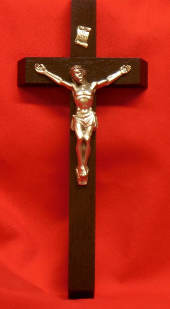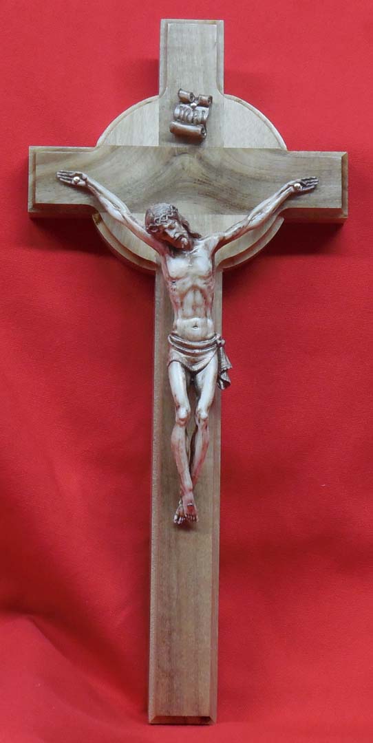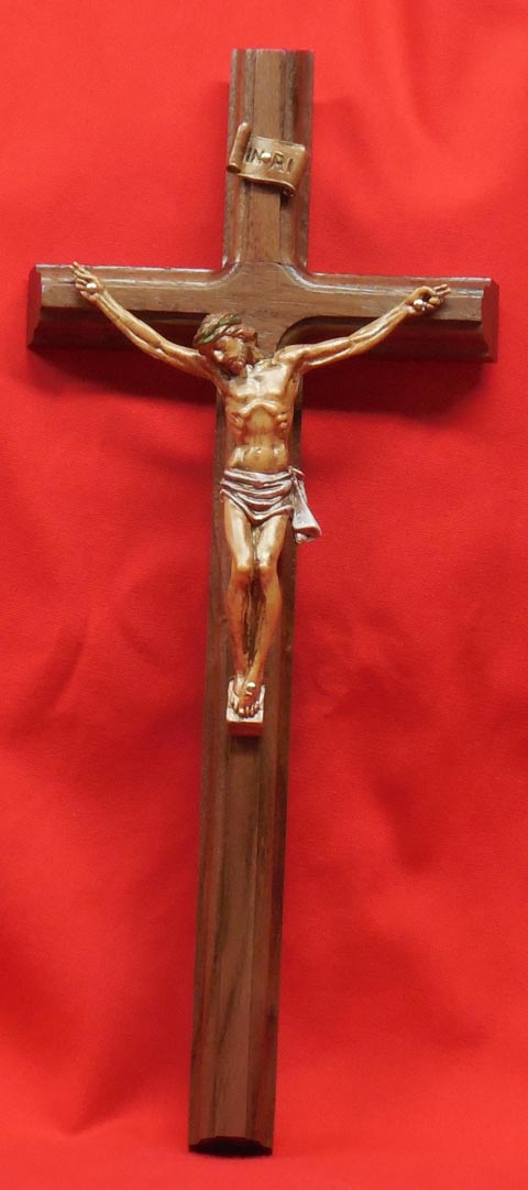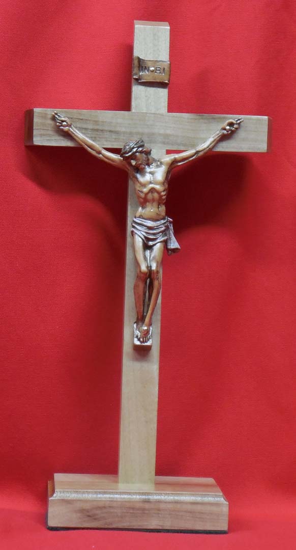 #454 Walnut with stand, silver painted resin corpus, and St. Benedict medallions. Made in February, 2016 Size = 12" Price = $54 |