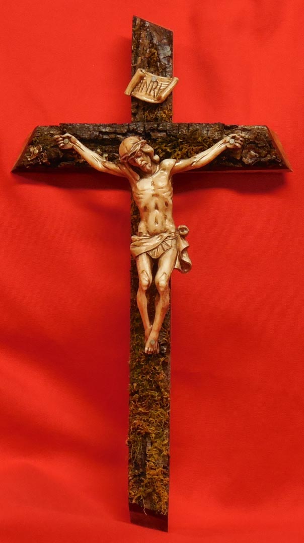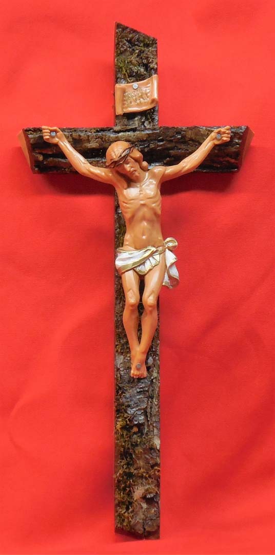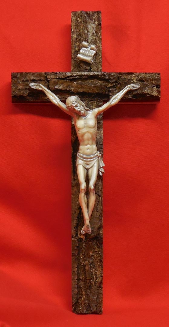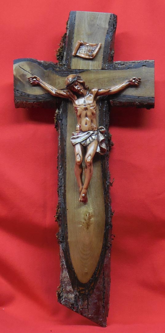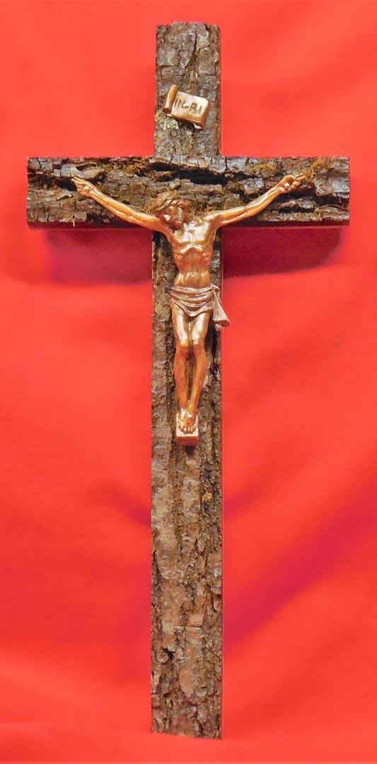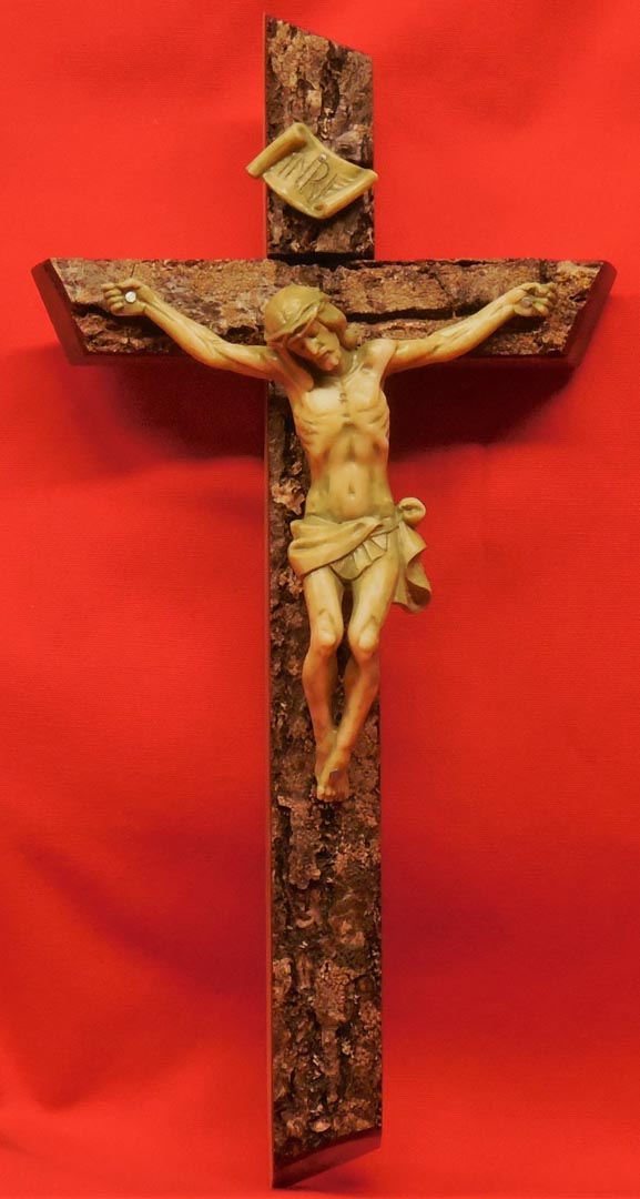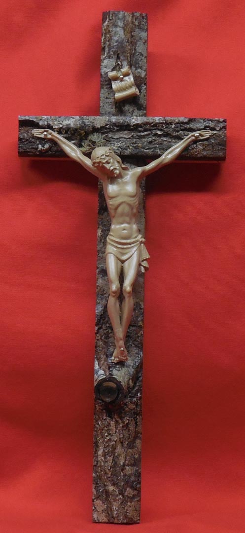 #459 Walnut bark with angled ends and Fontanini style resin corpus. Made in May, 2016 Size = 14" Price = $49 |