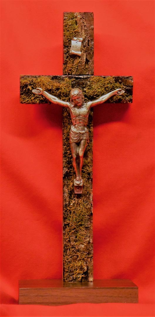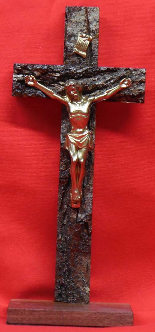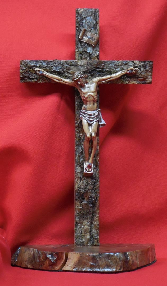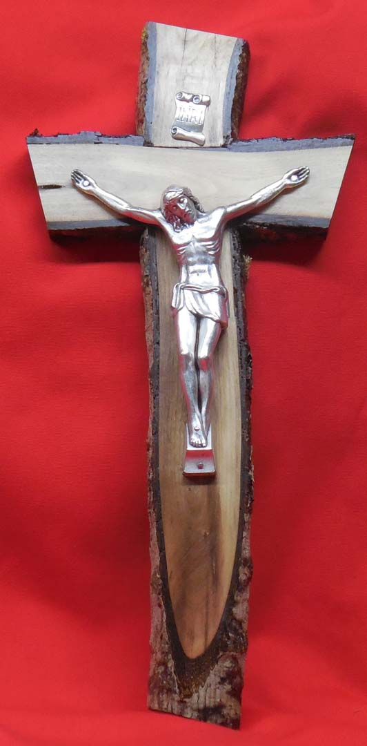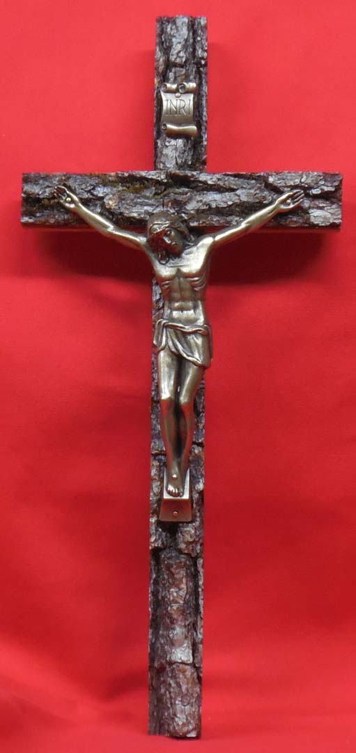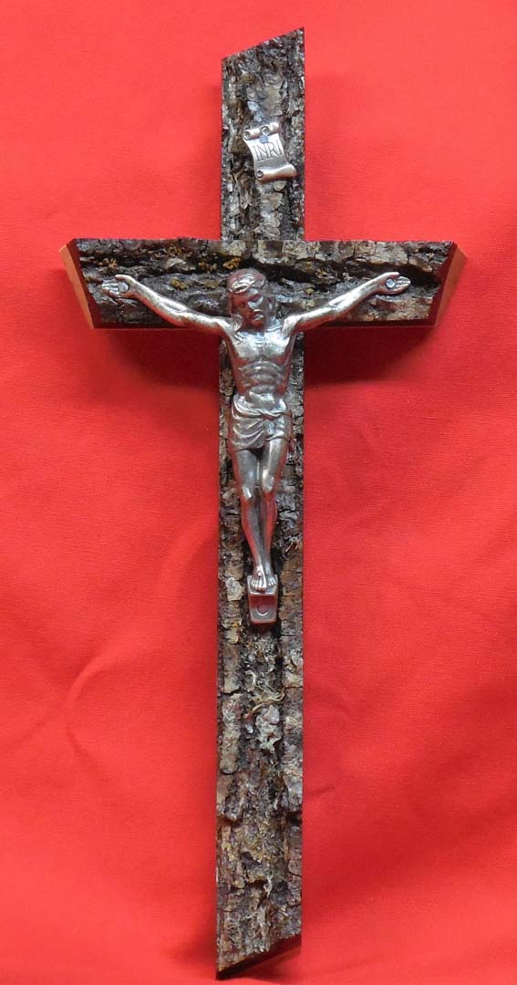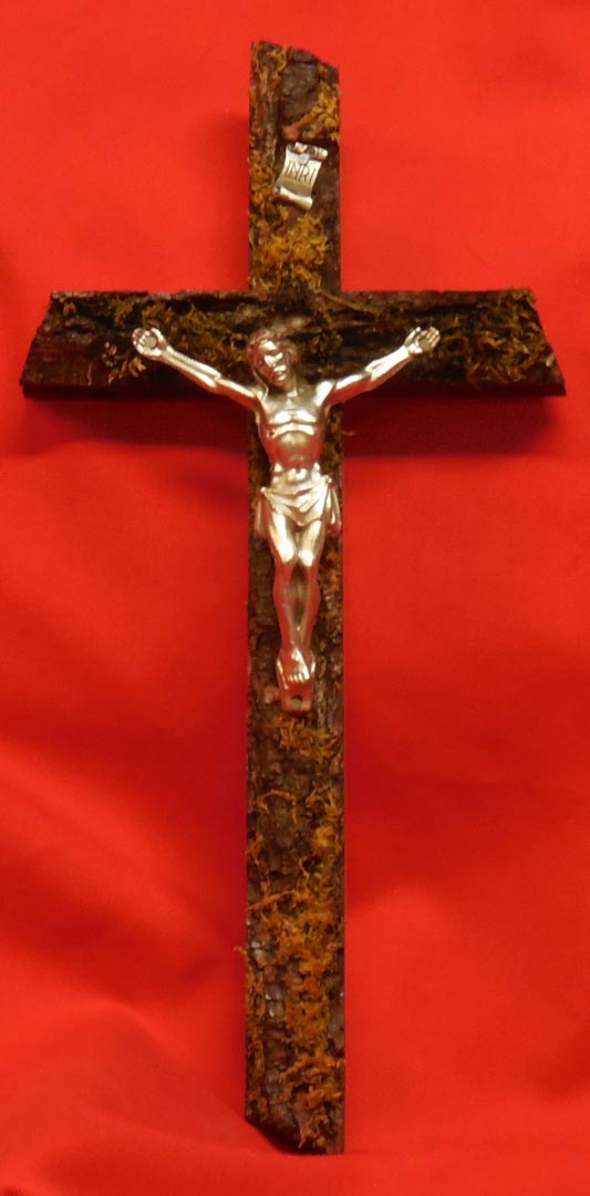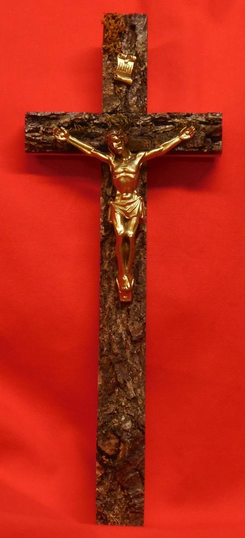 #459 Walnut bark with angled ends and Fontanini style resin corpus. Made in May, 2016 Size = 14" Price = $49 |