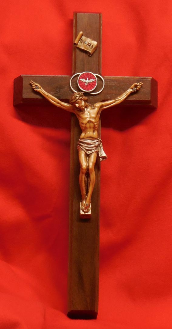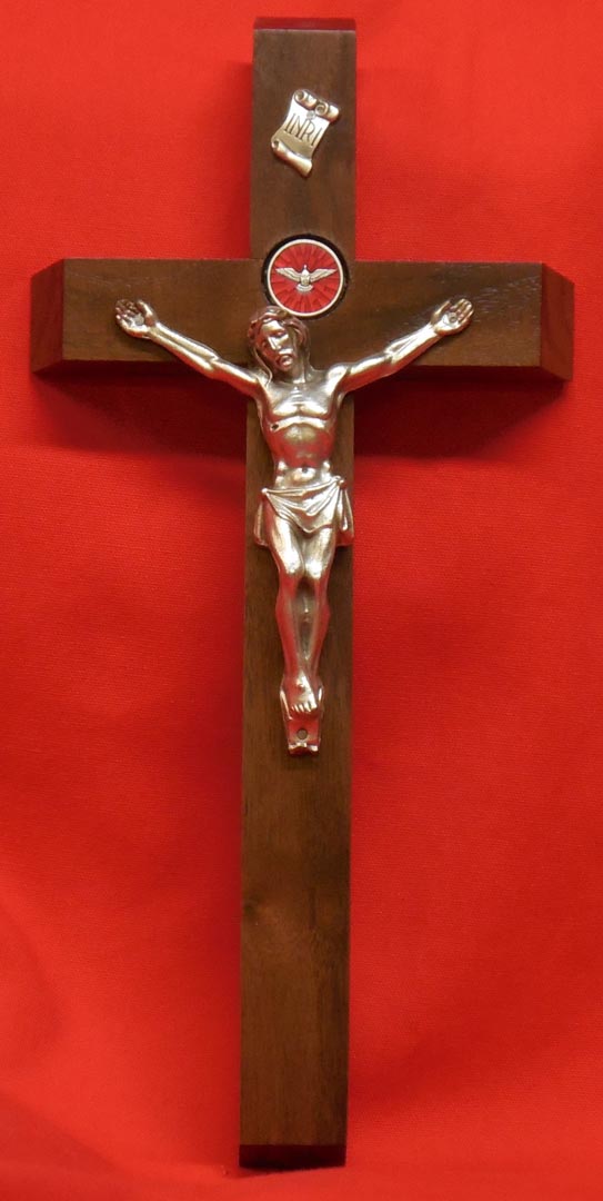 #484 Walnut with angled ends, Holy Spirit medallion, and silver metal corpus Made in November, 2016 Size = 12" Price = $44 |
