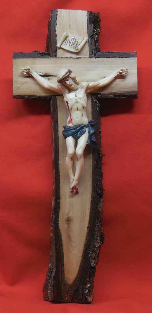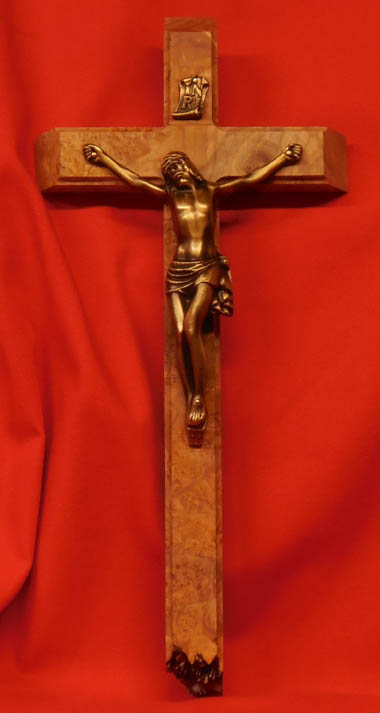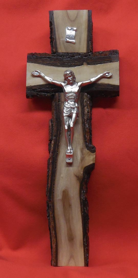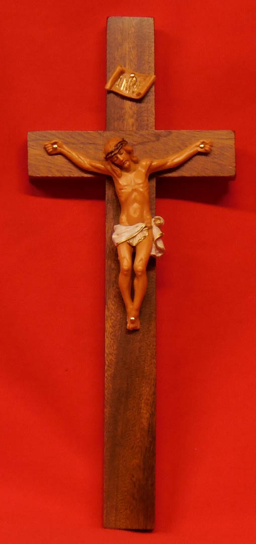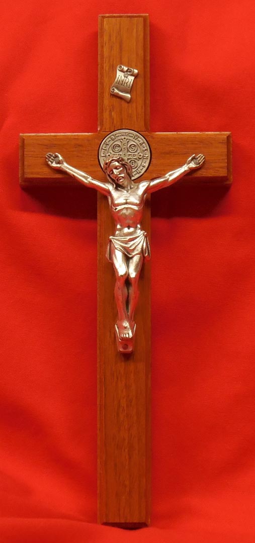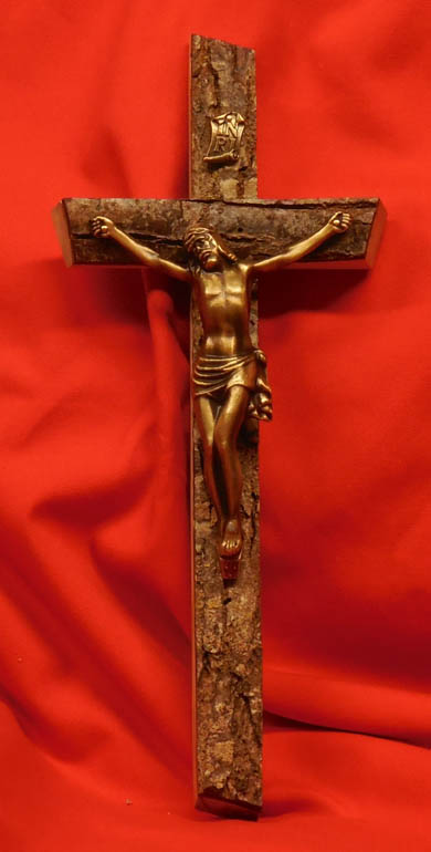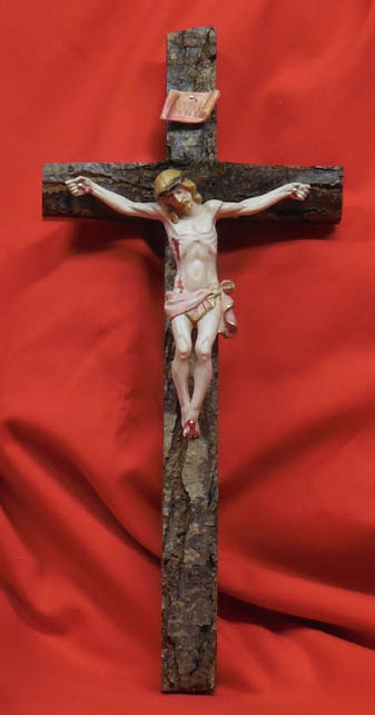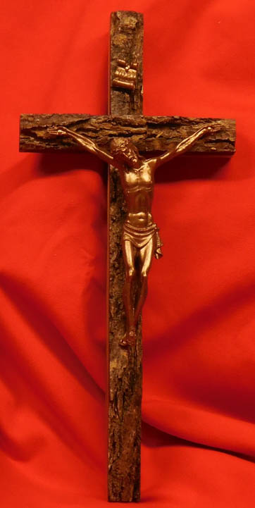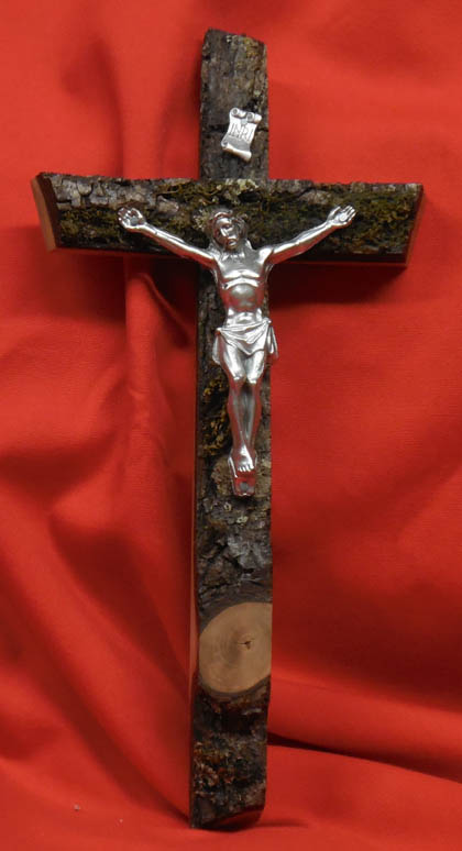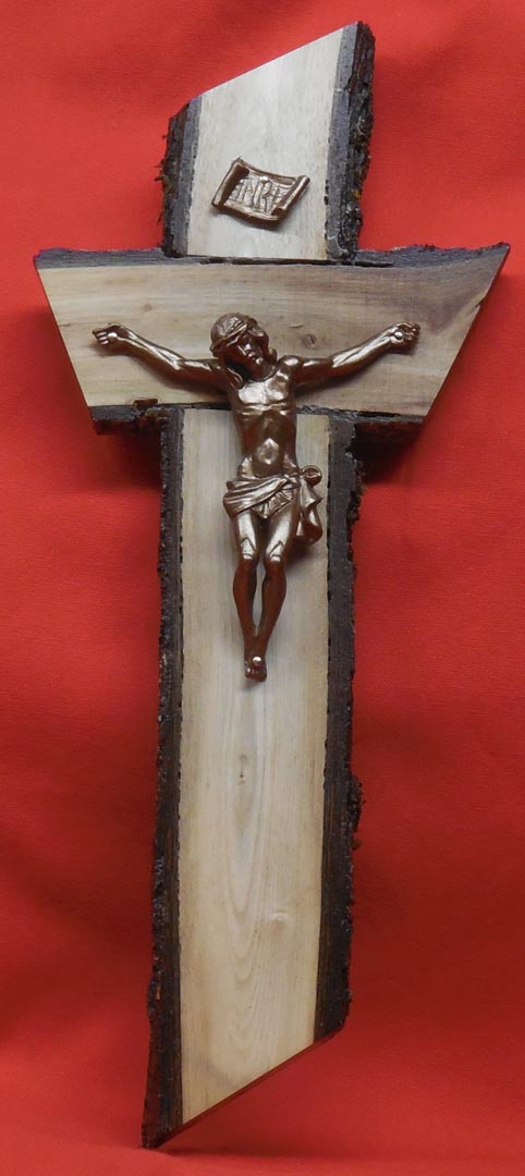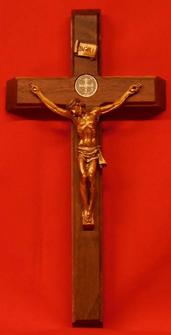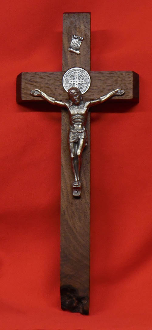 #524 Walnut with trimmed edges, antiqued resin corpus, and St. Benedict medallion Made in September, 2017 Size = 12" Price = $49 |