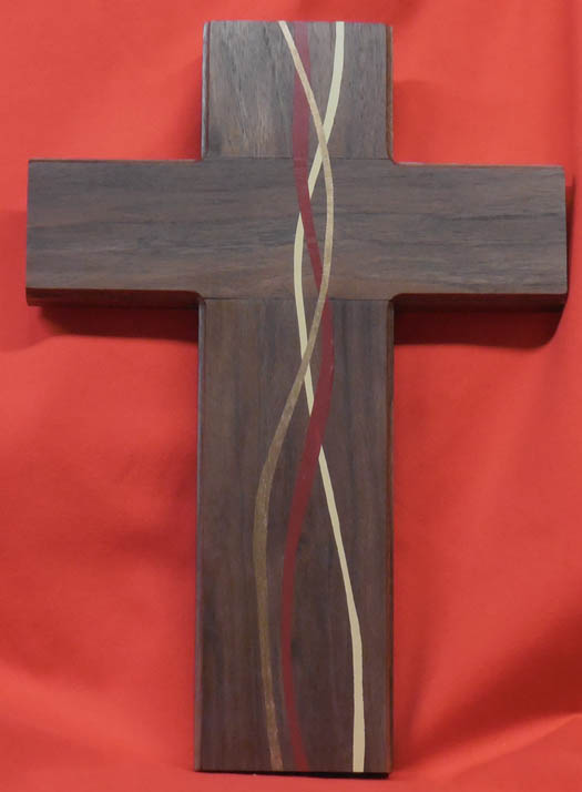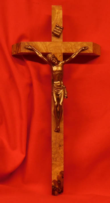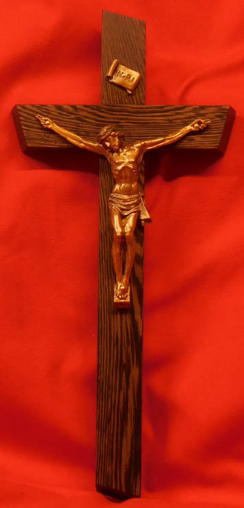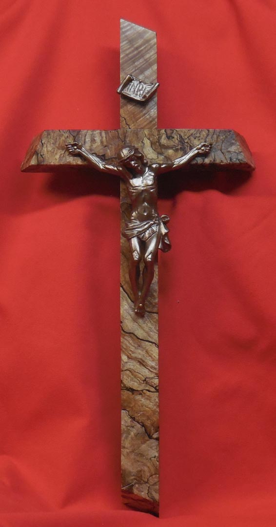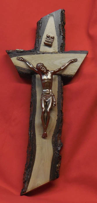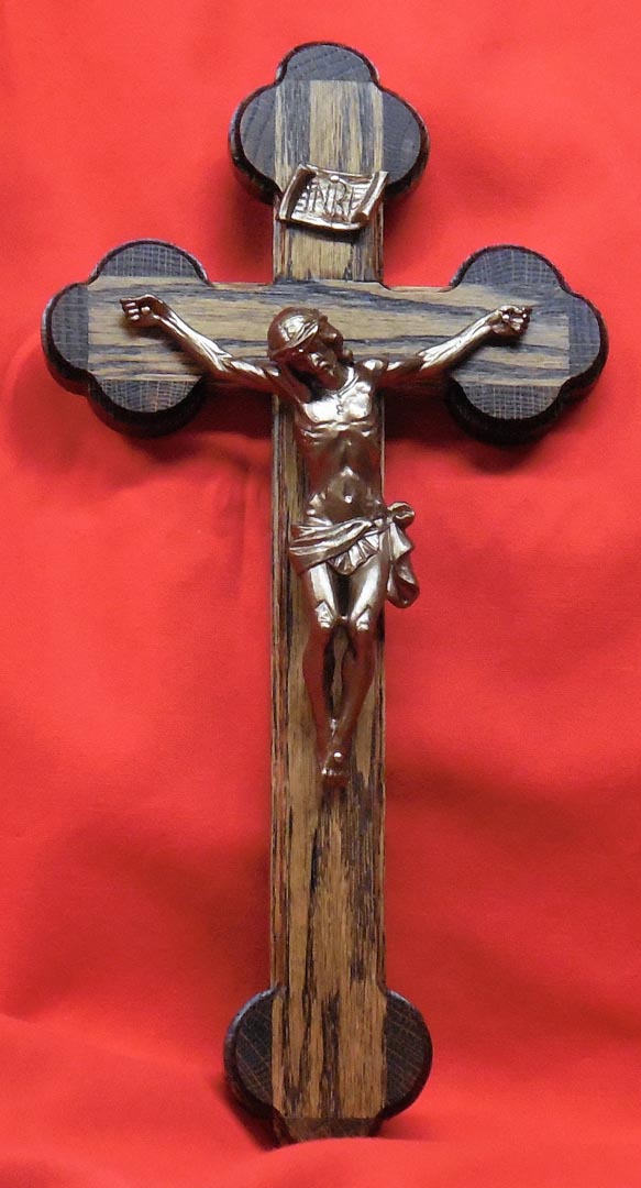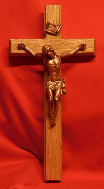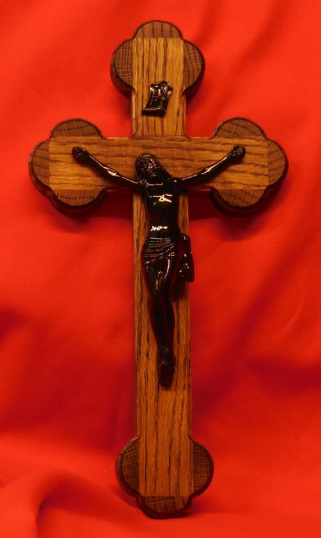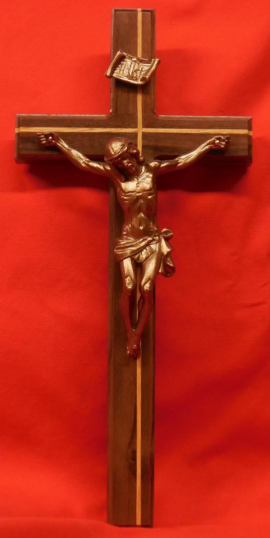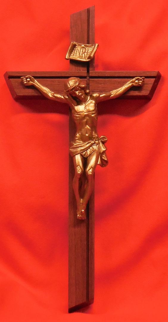 #528 Walnut with trimmed edges and polycrylic hand-painted antiqued corpus. Made in November, 2017 for Knights of Columbus in Shaw, OR Size = 22" Price = $195 |