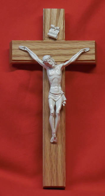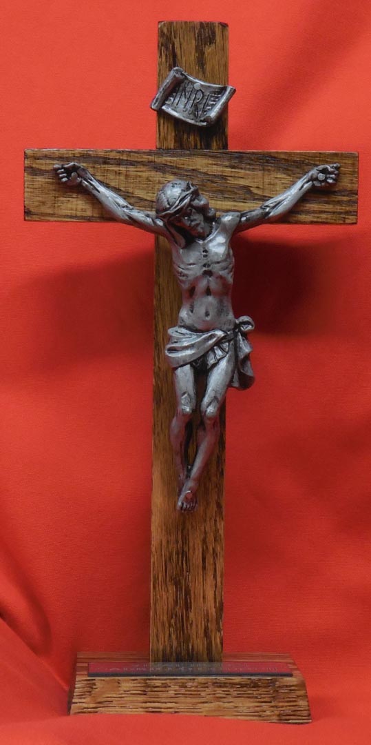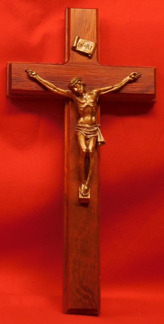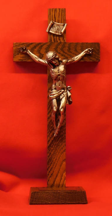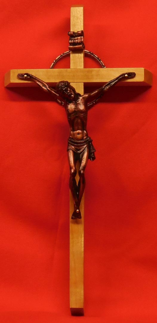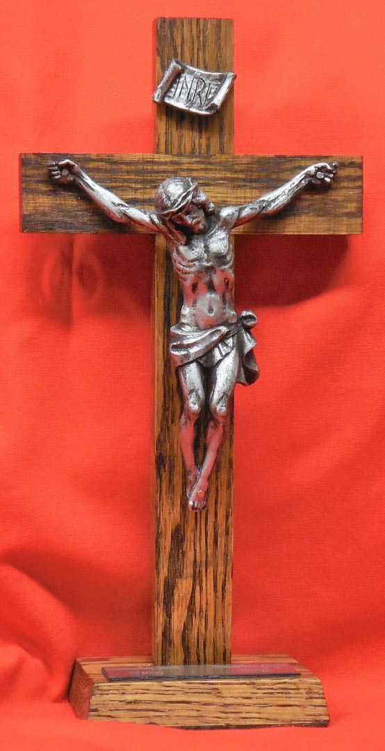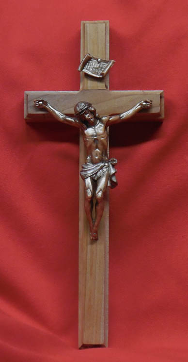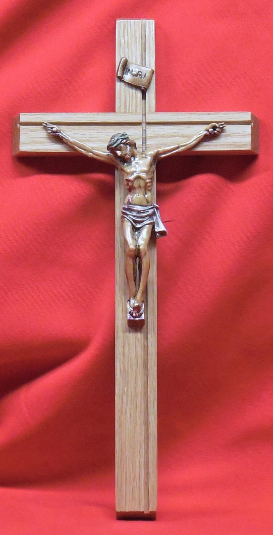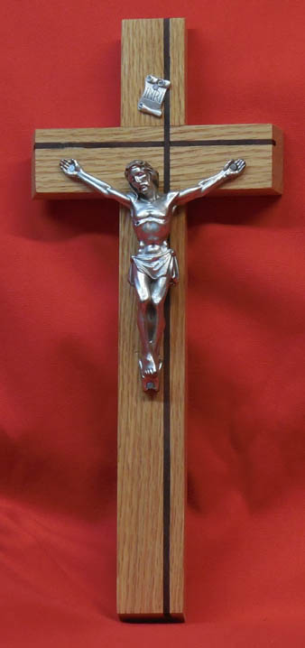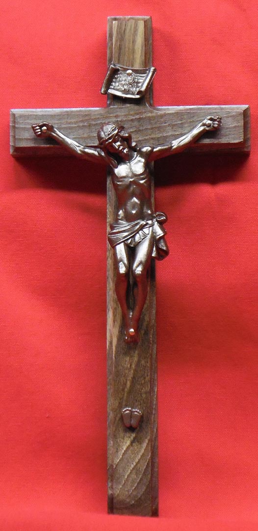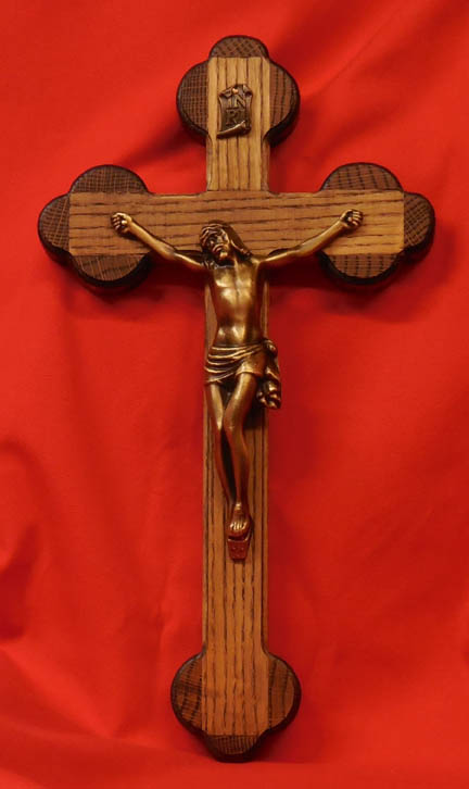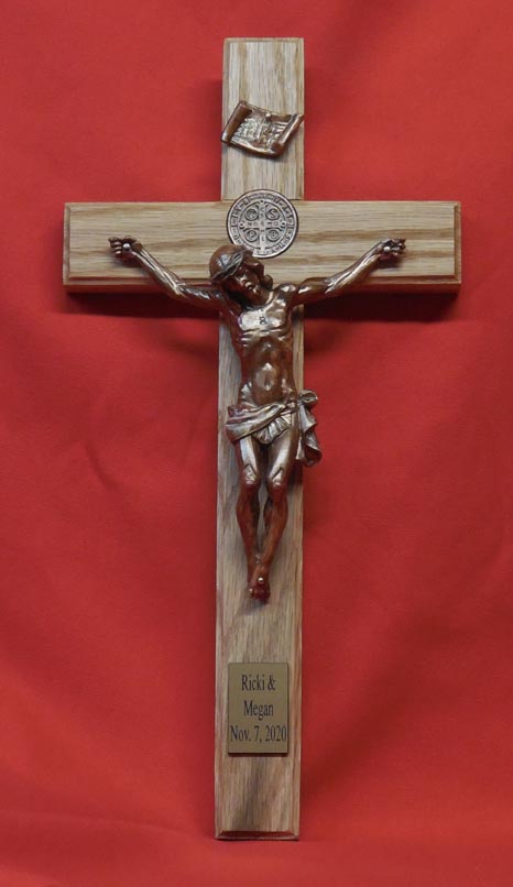 #579 Oak with antiqued bronze corpus, St. Benedict medallion, and dedication tag Made in May, 2019 & Oct, 2020 Size = 14" Price = $69 |