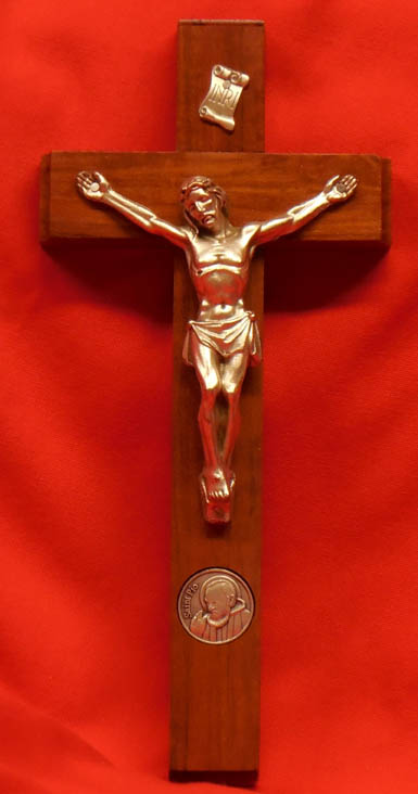 #592 Walnut with square ends, Padre Pio medallion, and silver metal corpus Made in October, 2019 Size = 12" Price = $44 |